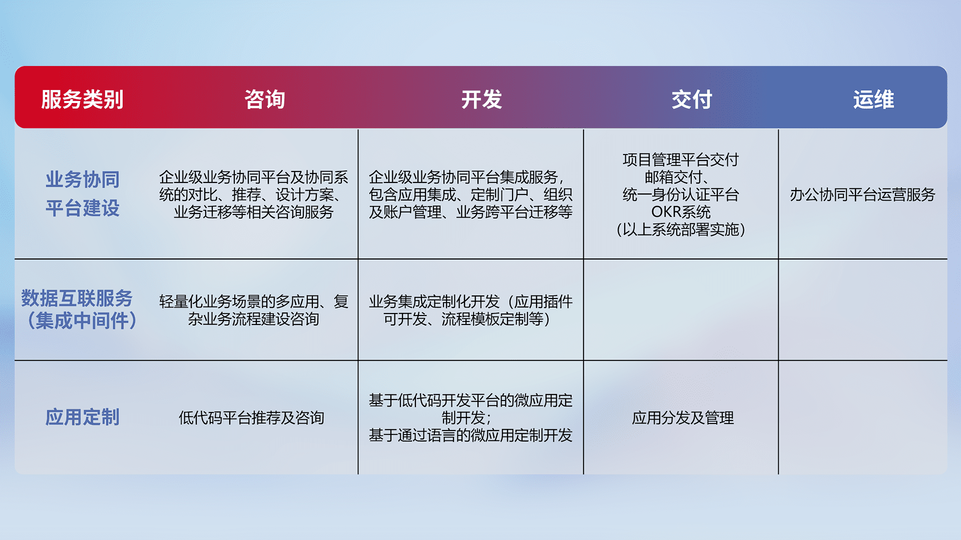 针对钉钉、、、企微、、IDaas等平台级产品提供产品的规划、、、方案、、、交付、、、定制化开发等服务,,,实现如统一协同办公、、智能客户服务、、、、混合会议管理、、智能数据查询、、、、等业务场景,,,,实现数字化转型。。