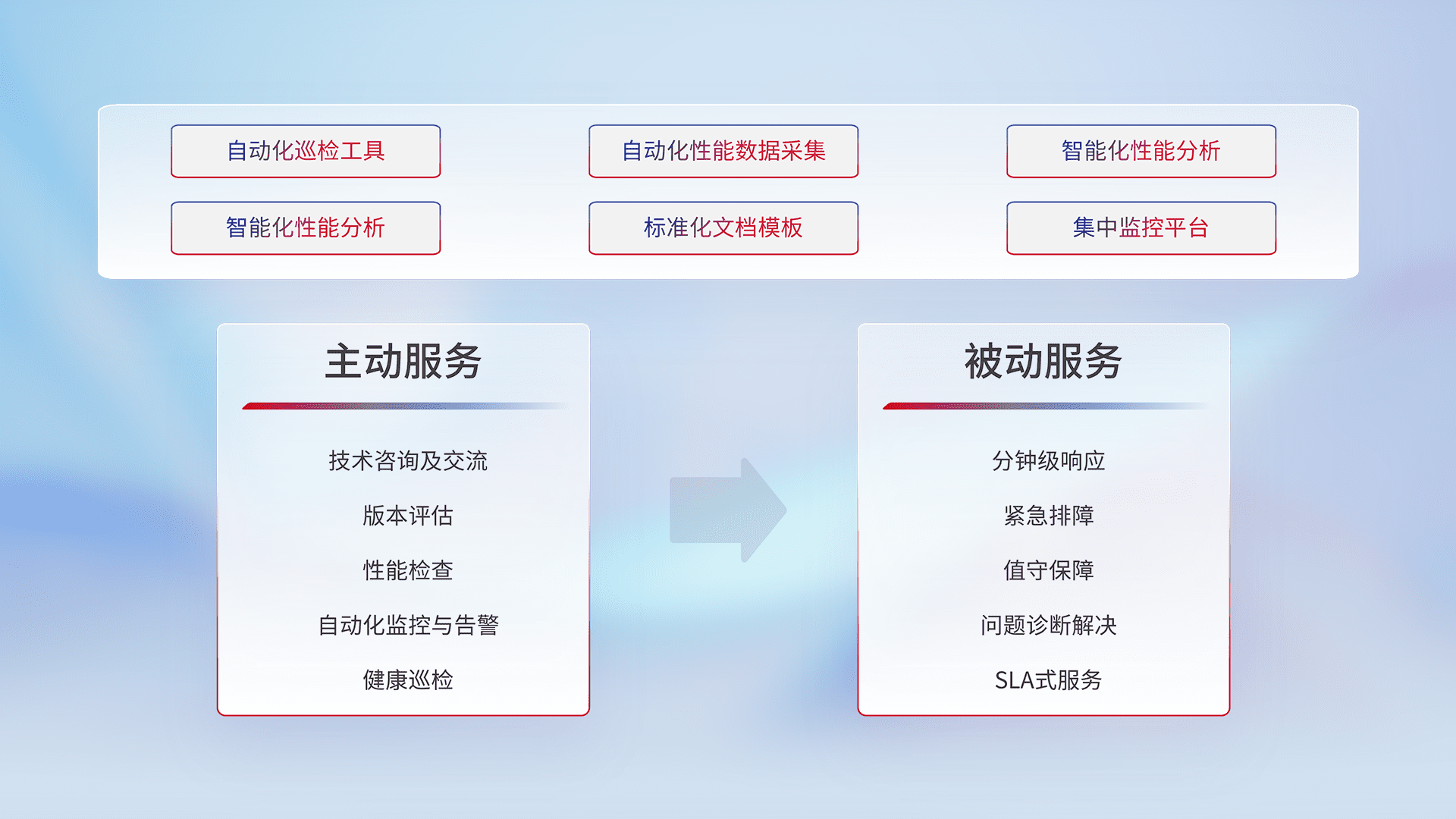 智能化工具和标准化文档,,保障服务质量,,,,提供主动服务(包含技术咨询、、、、版本评估、、性能检查、、、自动化监控与告警、、、健康巡检)和被动服务包含(分钟级响应、、紧急排障、、值守保障、、问题诊断解决、、SLA服务)。。